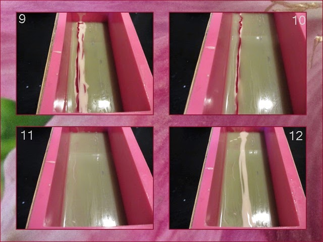 eingefüllt habe ich per Löffel, jeweils die erste Linie (weiß) aus dem Schälchen gegossen was folgte und die hellgrüne Basis via Quetschflasche